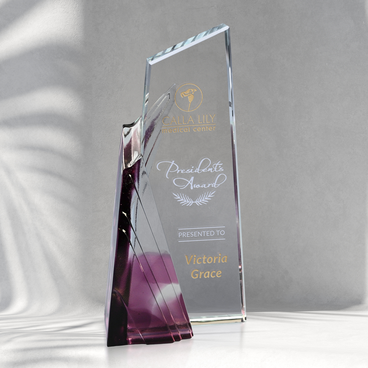 Recognize outstanding efforts with a one-of-a-kind award. Featuring the Liuli color glaze, the Achievement Purple Award showcases your recognition message surrounded by a translucent purple accent. This exceptional award was created to enhance any recognition occasion.