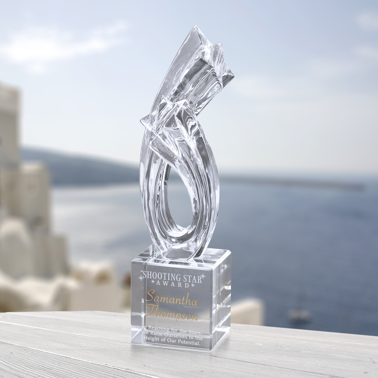 Two twisted stars atop an optical crystal star dance together for the most fanciful recipients. Your star achievers will love this beautiful award.
