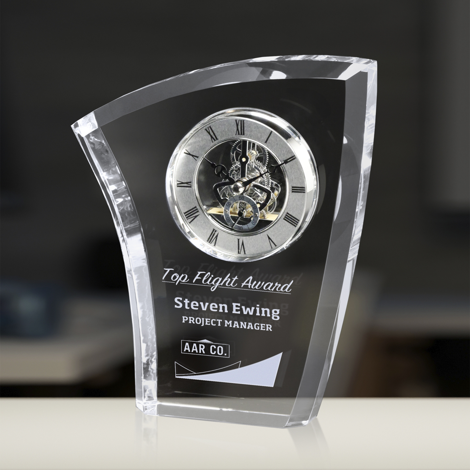 The Barbour Clock is an exquisite asymmetrical clock that is sure to delight a recipient. The curves of the clock and the silver analog clock face create a perfect award for a project manager or top volunteer.