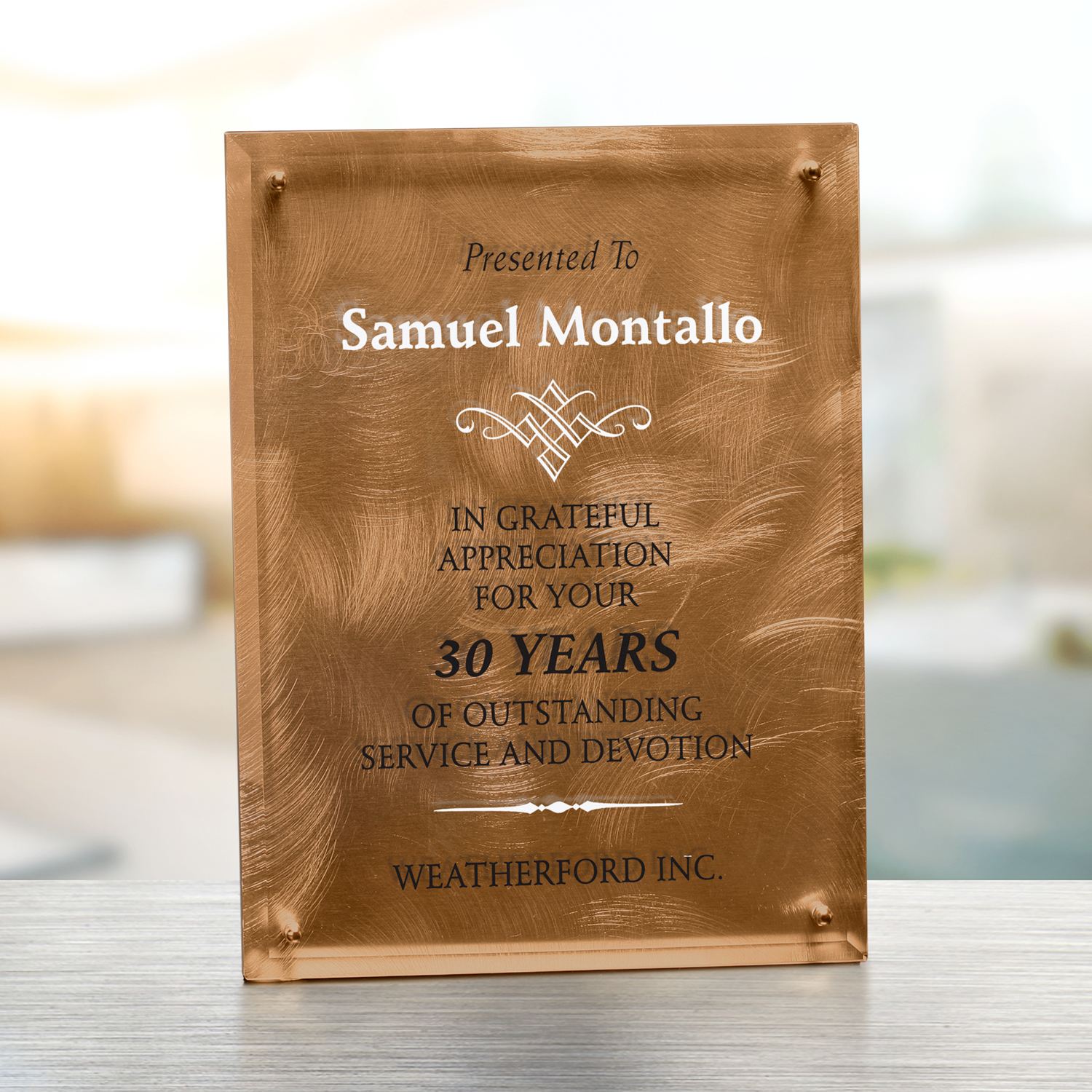 The Bronze Alloy Plaque’s swirled brushstrokes give it a unique look. With an optically clear panel, your artwork will pop and enhance any message of appreciation. Complete with an easel, this beautiful plaque is ready to display.