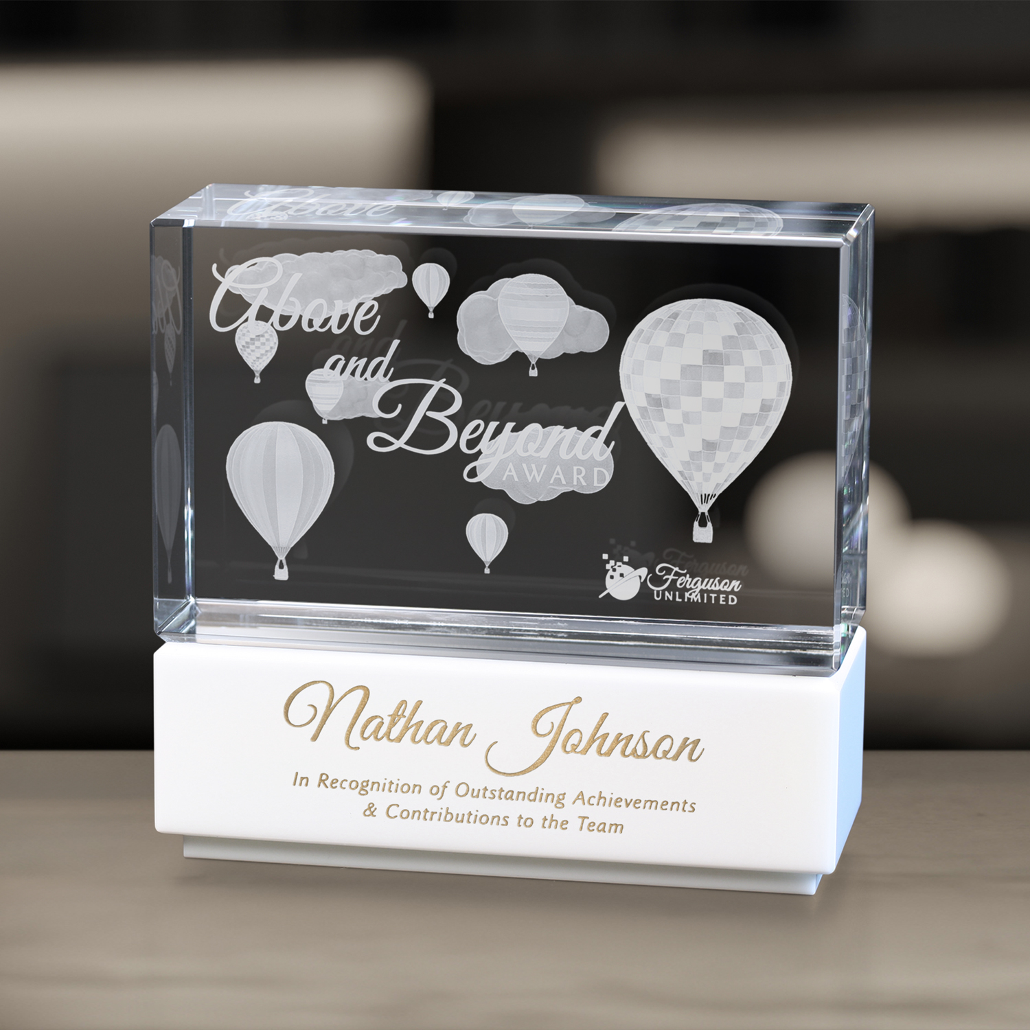 A sleek optical crystal rectangle sits on a beautiful bright white base. Place your perfect 3D artwork inside the optically clear portion of the Butler Imperial Cube for an incredible WOW factor.