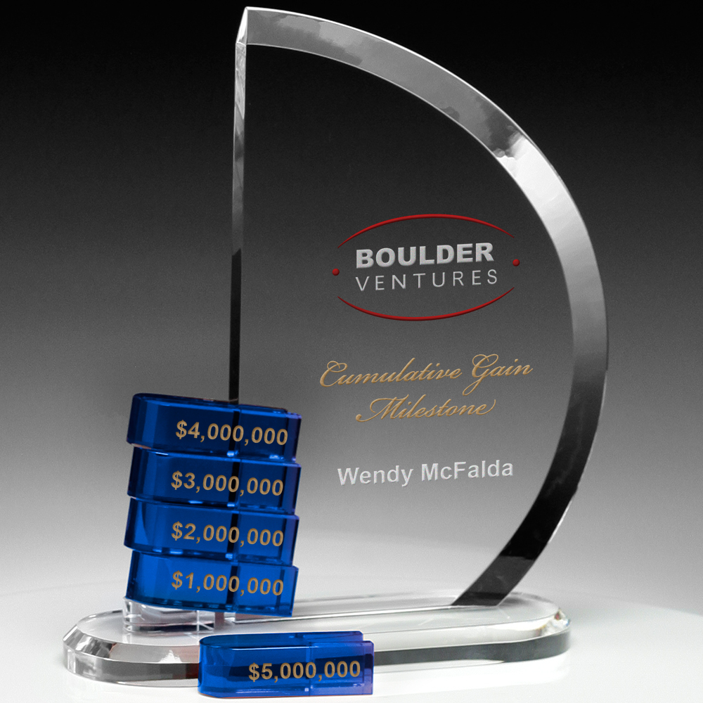 The Como Goal-Setter is an attractive semicircle accompanied by stackable rounded blocks that commemorate the goals your recipient has reached. The award and the blocks are made of optical crystal and can be customized with a message and goals of your choice. Blocks are available in red, blue, green, black and gold.