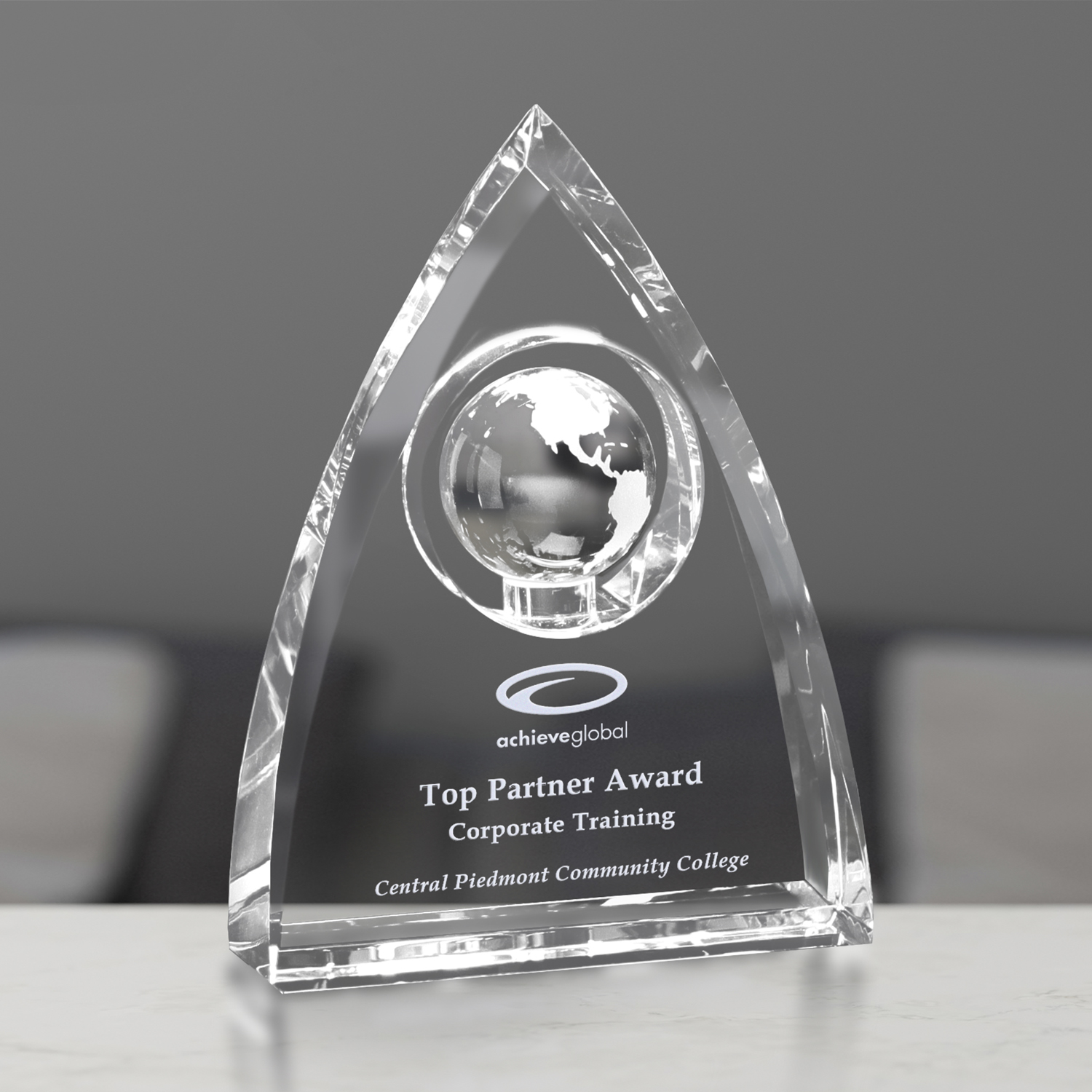 The Coronado Global Award is an exquisite optical crystal award that comes to a peak. This award has beveled edges and an optical crystal globe with space for a personalized message or image. The Coronado Global Award is available in four sizes.