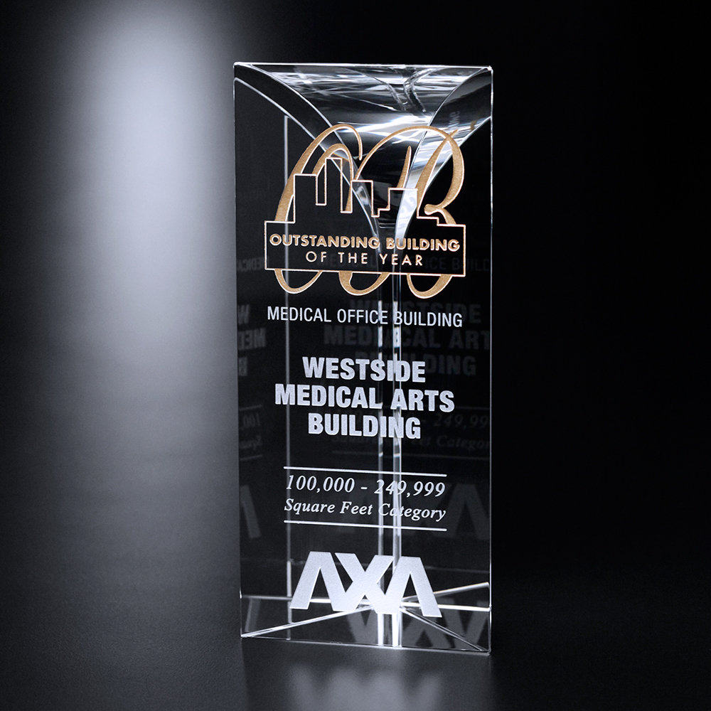 The Cosmopolitan Award, available in four sizes, is an exceptional award for a sophisticated recipient. The award dips down at the top, creating a design that is reminiscent of a martini glass.