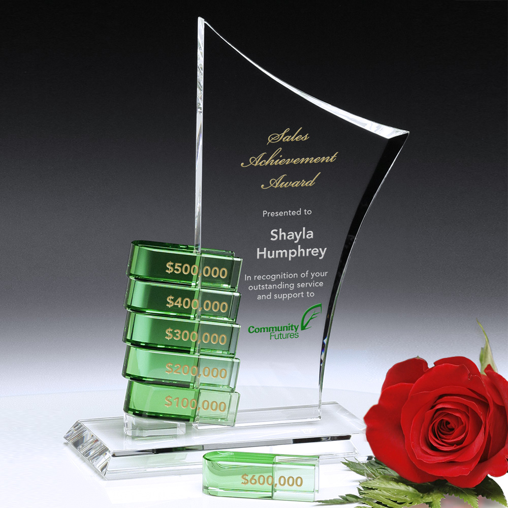 The Creston Goal-Setter is a lovely curved tower accompanied by stackable rounded blocks that commemorate the goals your recipient has reached. The award and the blocks are made of optical crystal and can be customized with a message and goals of your choice. Blocks are available in red, blue, green, black and gold.