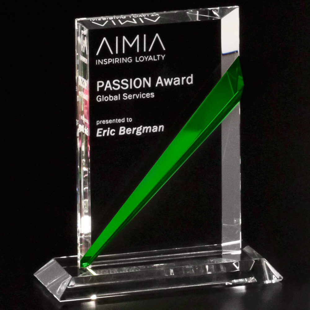 Emerald green crystal makes a dramatic appearance in the Danbury Rectangle as it extends across the award with great energy, ultimately leading the eye upward towards the sky! While the optical crystal portions of this award offer multiple imprint areas – each one could be used to highlight a different message of appreciation!