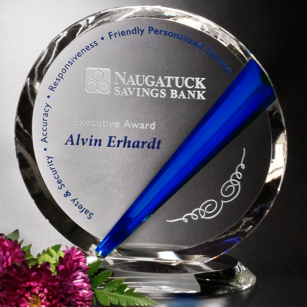 The Danbury Indigo Circle has an extraordinary blue streak that draws the eye upward. This award is made of optical crystal and can be personalized with your image or message. The Danbury Indigo Circle is available in three sizes.