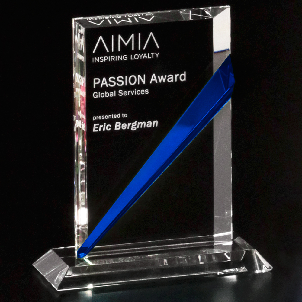 The Danbury Indigo Rectangle has an extraordinary blue streak that draws the eye upward. This award is made of optical crystal and can be personalized with your image or message. The Danbury Indigo Rectangle is available in three sizes.