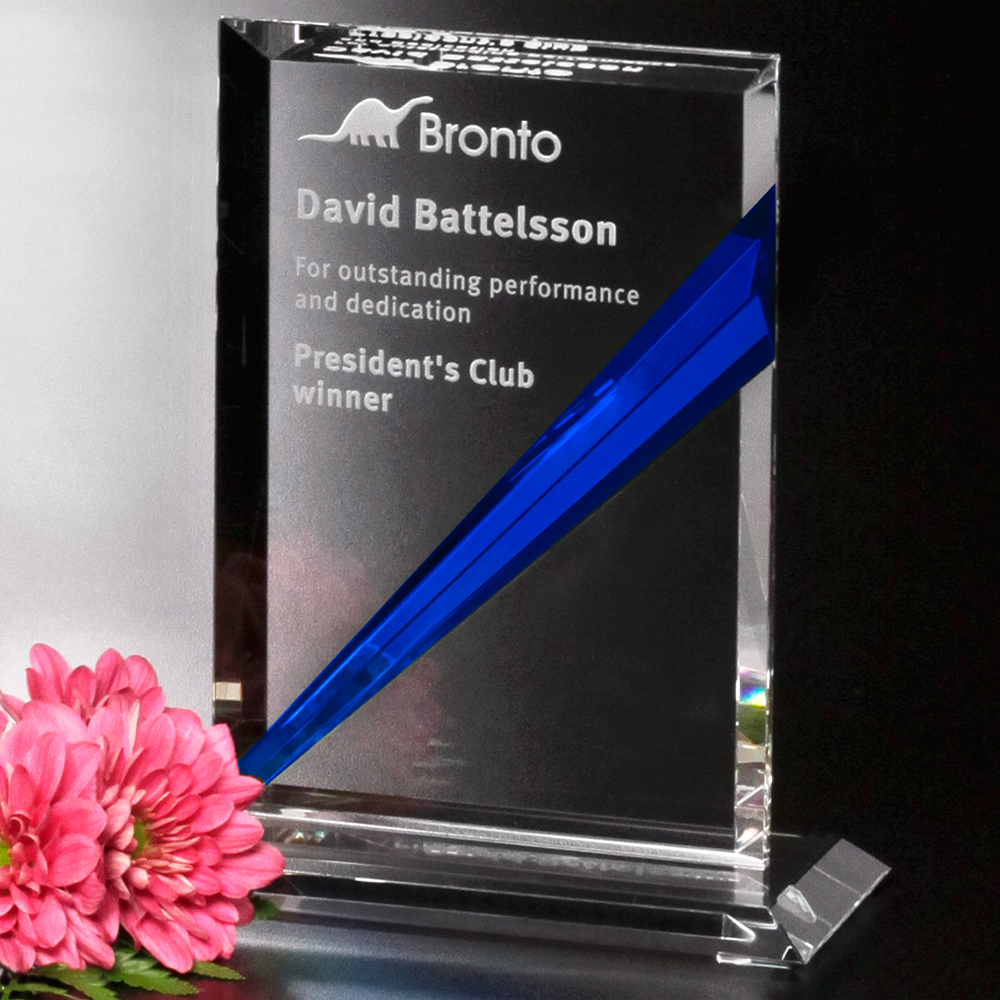 The Danbury Indigo Rectangle has an impressive blue streak that draws the eye upward. This award is made of optical crystal and can be personalized with your image or message. The Danbury Indigo Rectangle is available in three sizes.