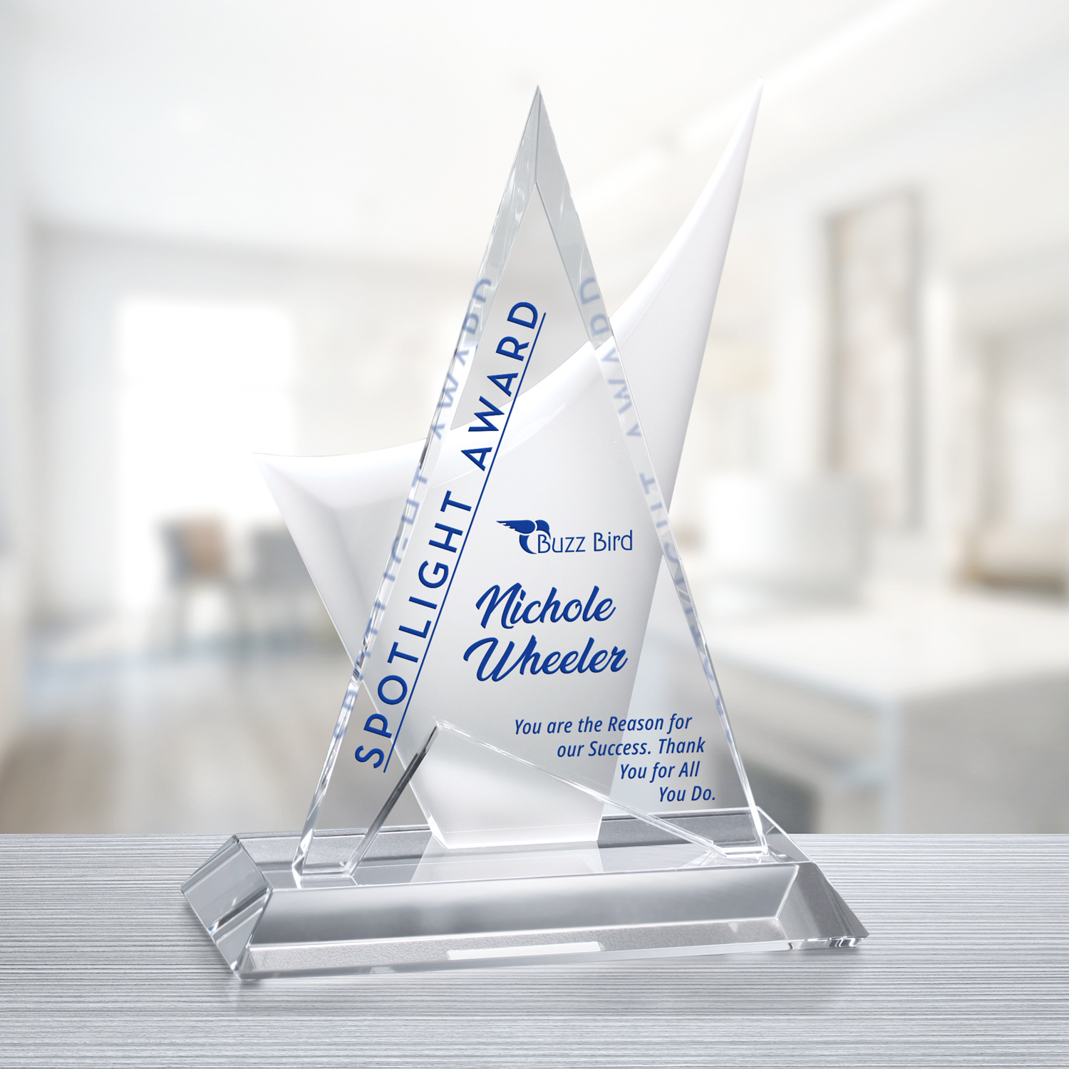 The Enterprise Award features a stunning asymmetric design that is sure to excite any recipient. An optical crystal triangle opposing a white crystal swoosh creates a stunning award for any recognition occasion.