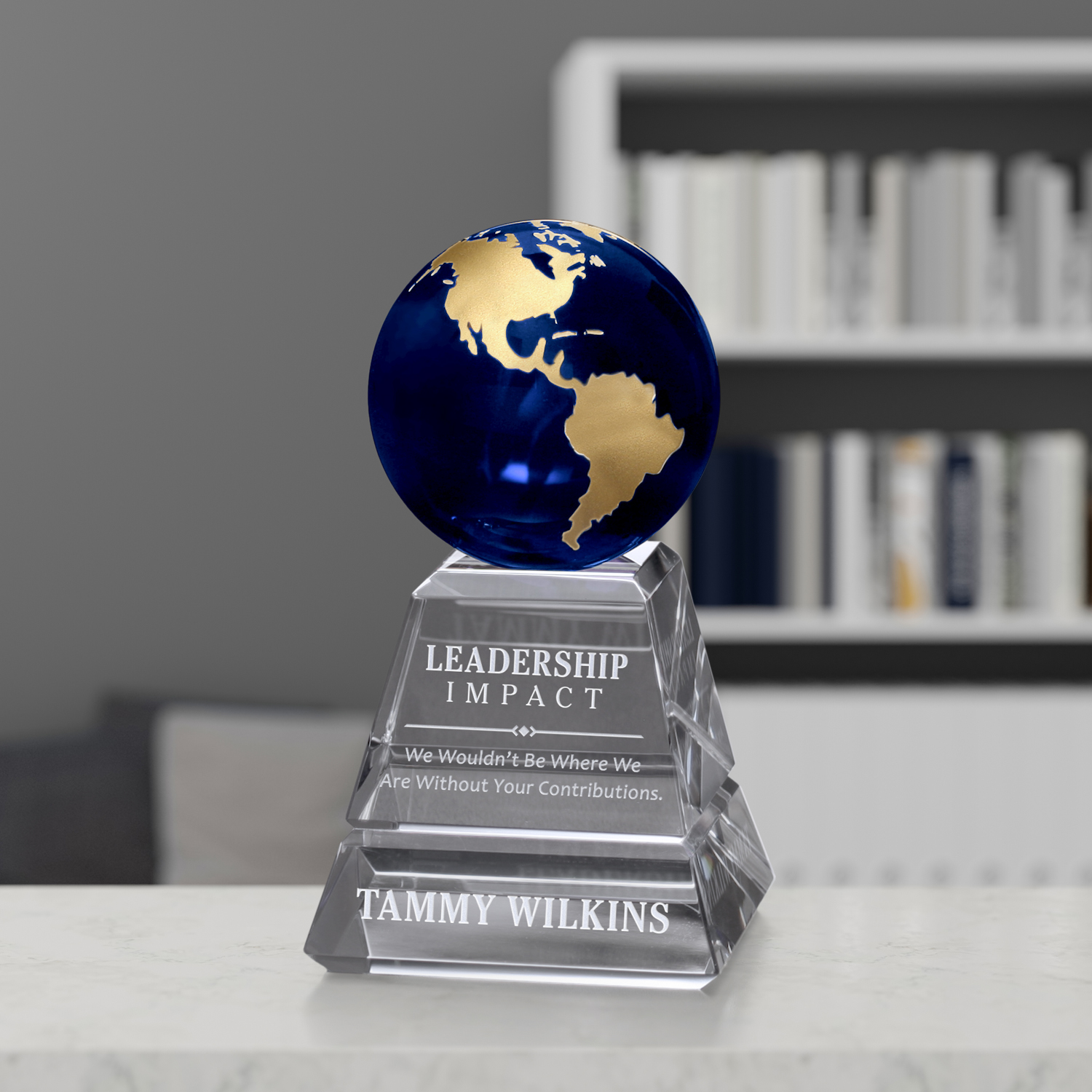 A deep blue globe with gold continents is perfect for worldwide excellence. The Explorer Globe will leave a lasting impression on your recipients.