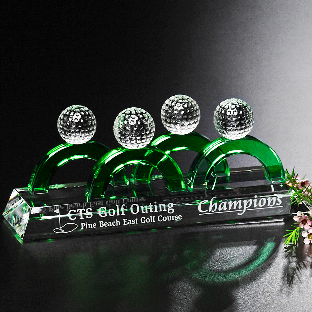 The illusion of four golfers intertwined in a foursome captures the Foresome Award perfectly. The combination of emerald green crystal and clear crystal is beautiful!
