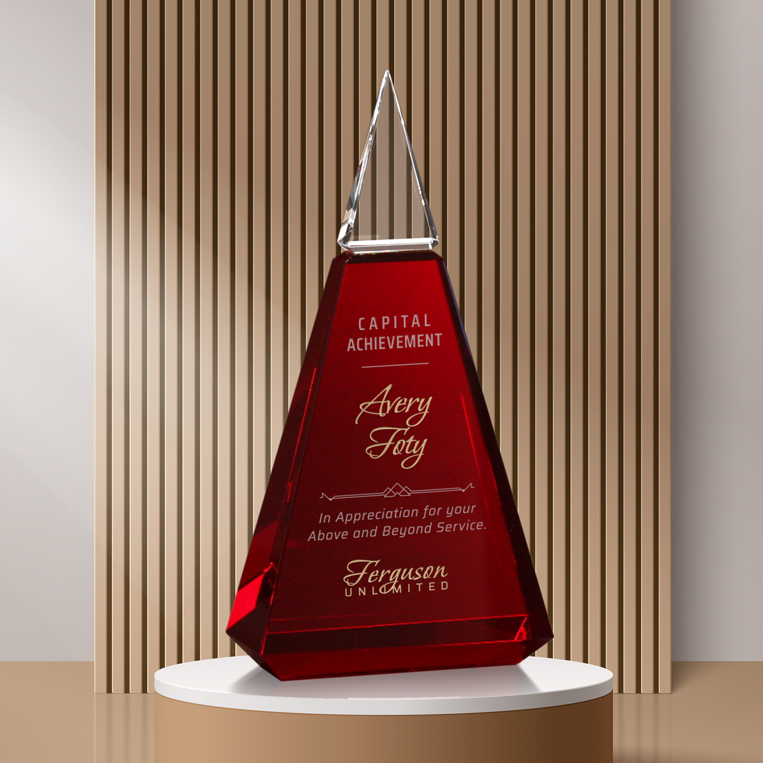 A deep red crystal base with a small pointed apex provides the perfect canvas for an amazing recognition award. The Giza Pyramid will delight your top recipients!