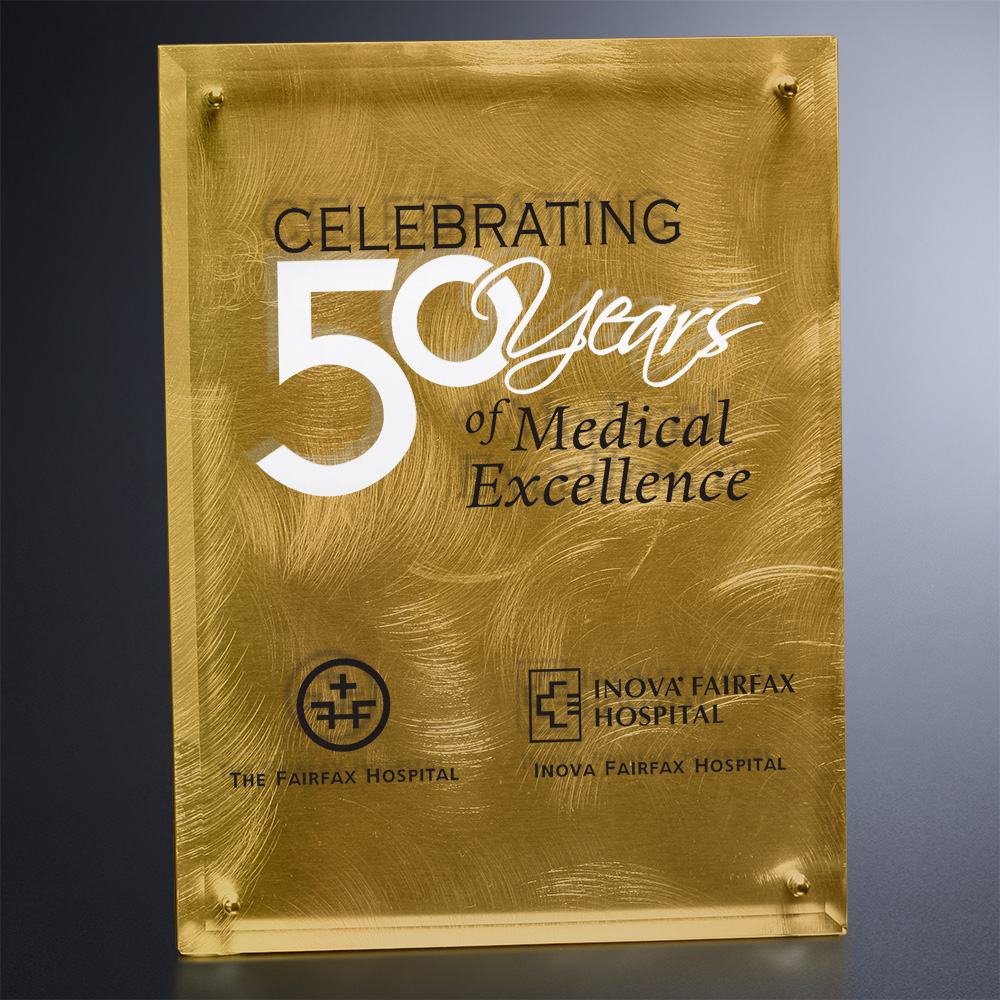 The Gold Alloy Plaque’s swirled brushstrokes give it a unique look. With an optically clear panel, your artwork will pop and enhance any message of appreciation. Complete with an easel, this beautiful plaque is ready to display.