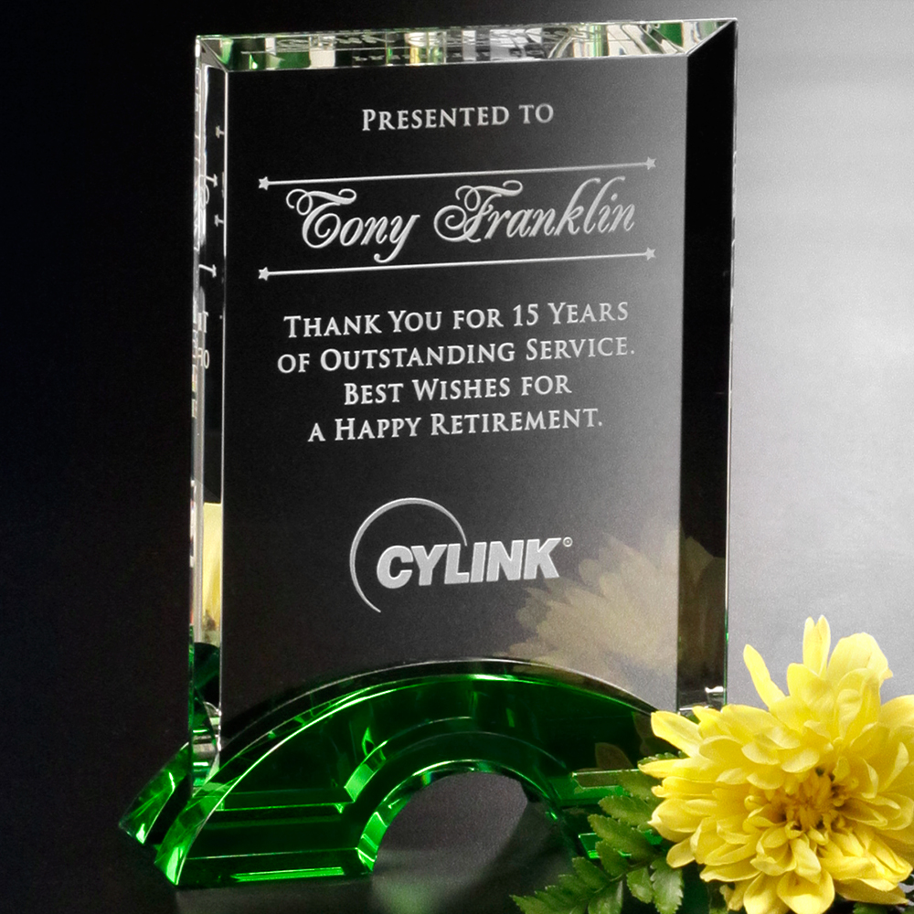 The Greenbury Rectangle is an award that rests on a small foundation of emerald crystal. This foundation boasts a gorgeous rectangle of stunning optical offering unlimited appeal! The imprint method used on this award plus a few heartfelt sentiments will create an award that is unique to any recognition moment.