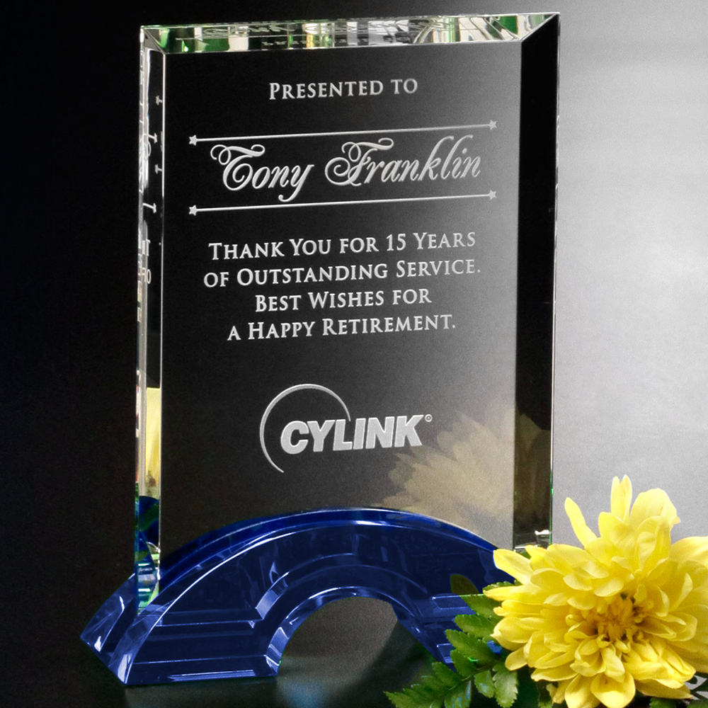 The Greenbury Indigo Rectangle is an elegant award for any recipient. Its blue crystal arched base accentuates the clear optical crystal rectangle. The rectangle has ample space for customization, and the Greenbury Indigo Rectangle is available in three sizes.