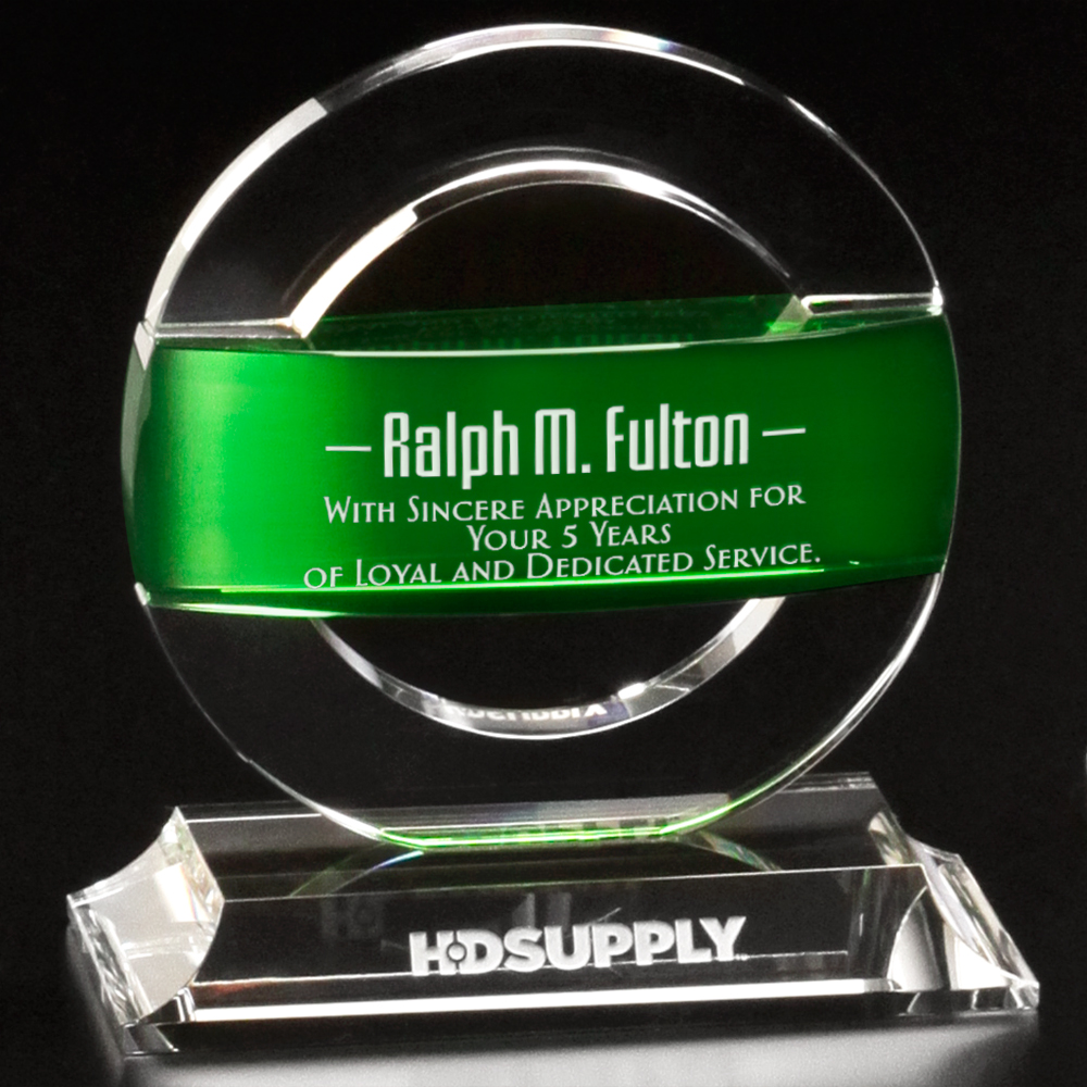 A broad emerald green band of gorgeous crystal cuts the captivating design of the Greenville Award in half and creates symmetry in design. The contemporary curvature of the optically clear crystal frames the emerald band perfectly! This award was created for a recipient who has risen to a challenge and conquered it triumphantly.