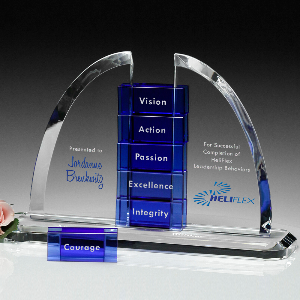 The Hallock Goal-Setter is an incredible arch design with space in the middle where your recipient can stack the crystal blocks that commemorate the goals they have reached. The award and the blocks are made of optical crystal and can be customized with a message and goals of your choice. Blocks are available in red, blue, green, black and gold.