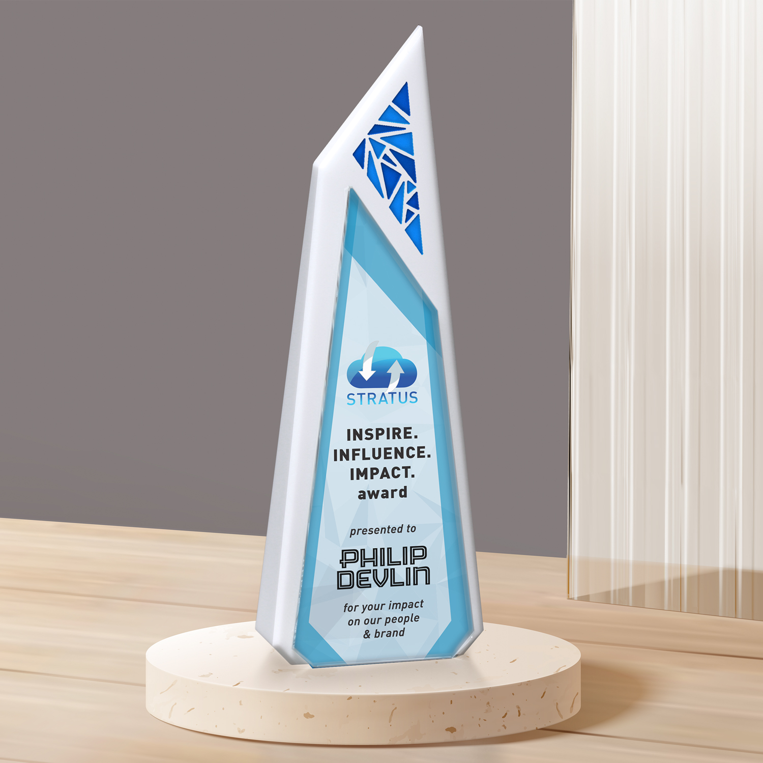 A bright white panel is the backdrop for a smaller optical crystal panel that features a full-color Illumachrome� imprint. The Hanover Award is a beautiful option for your most graceful winners.