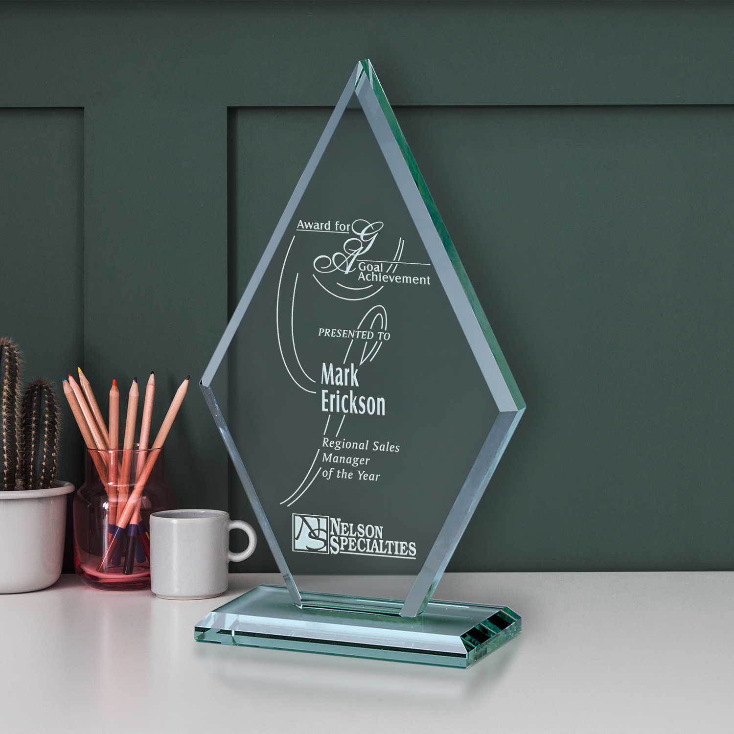 The dramatic jade crystal Premier Diamond award made of hand-cut jade crystal with beveled edges, mounted on a beveled jade crystal base.