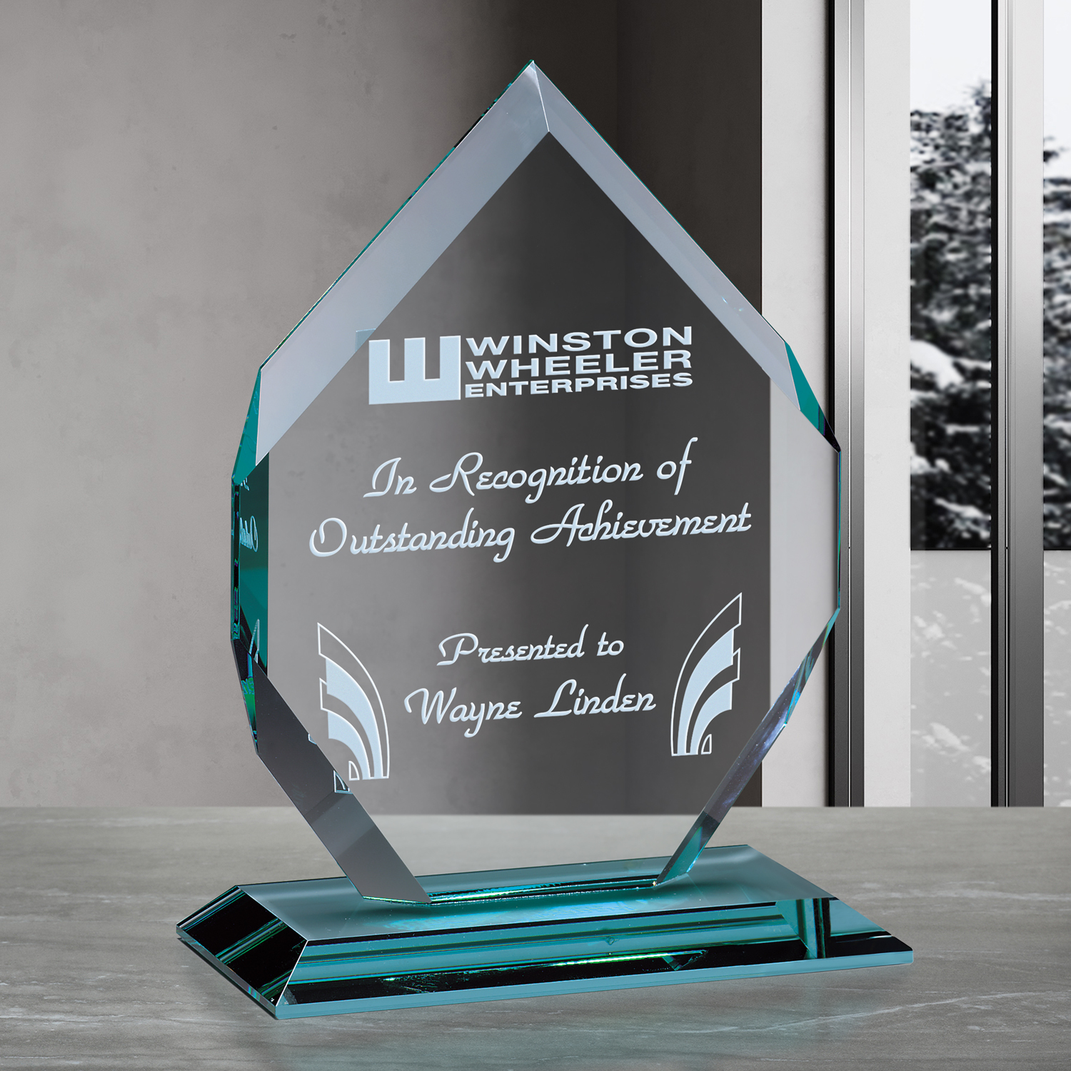 A myriad of cuts and bevels brings out the brilliant color of this jade crystal Regal Diamond award. A truly dramatic statement to reward success and achievement.
