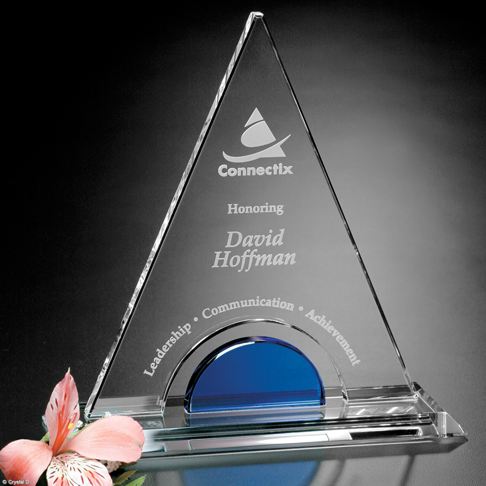 This exclusive design combines the brilliant colored half circle accent with the tower of crystal. A lasting treasure for any mantel or desktop.