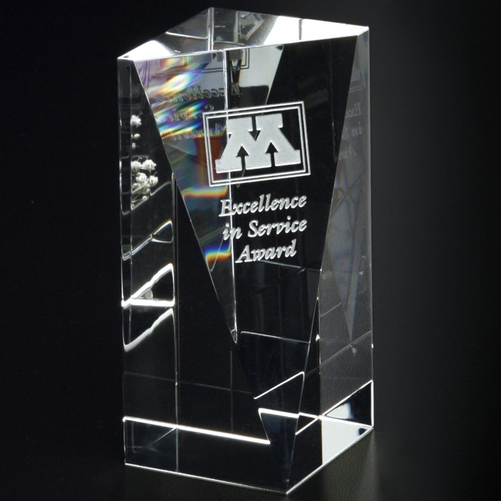A stunning optically perfect crystal rectangular cube award features a bold beveled etching area. The perfect award to display success and achievement.
