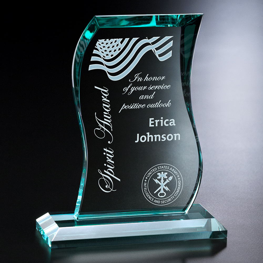 A flowing jade crystal gives a soft touch to the Julian Wave award. Tranquil and unpretentious, this award is a reflection of true excellence.