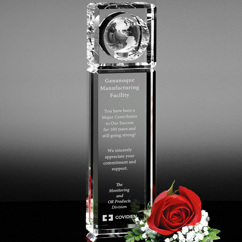 The Kilmer Global Award is made of magnificent optical crystal. The top of this award is a square with a globe in its center. It sits atop a rectangle that has ample space for a personalized image and message. The Kilmer Global Award is available in three sizes.