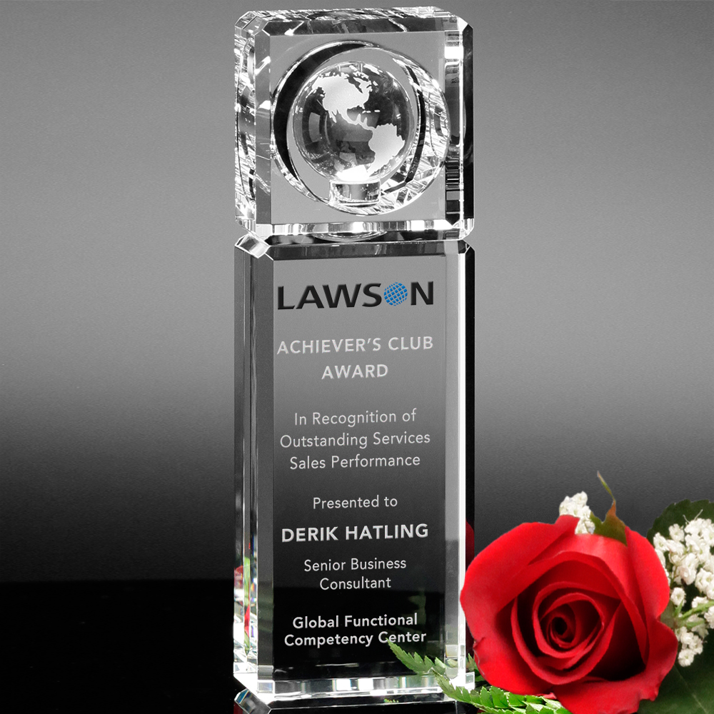 The Kilmer Global Award is made of incredible optical crystal. The top of this award is a square with a globe in its center. It sits atop a rectangle that has ample space for a personalized image and message. The Kilmer Global Award is available in three sizes.