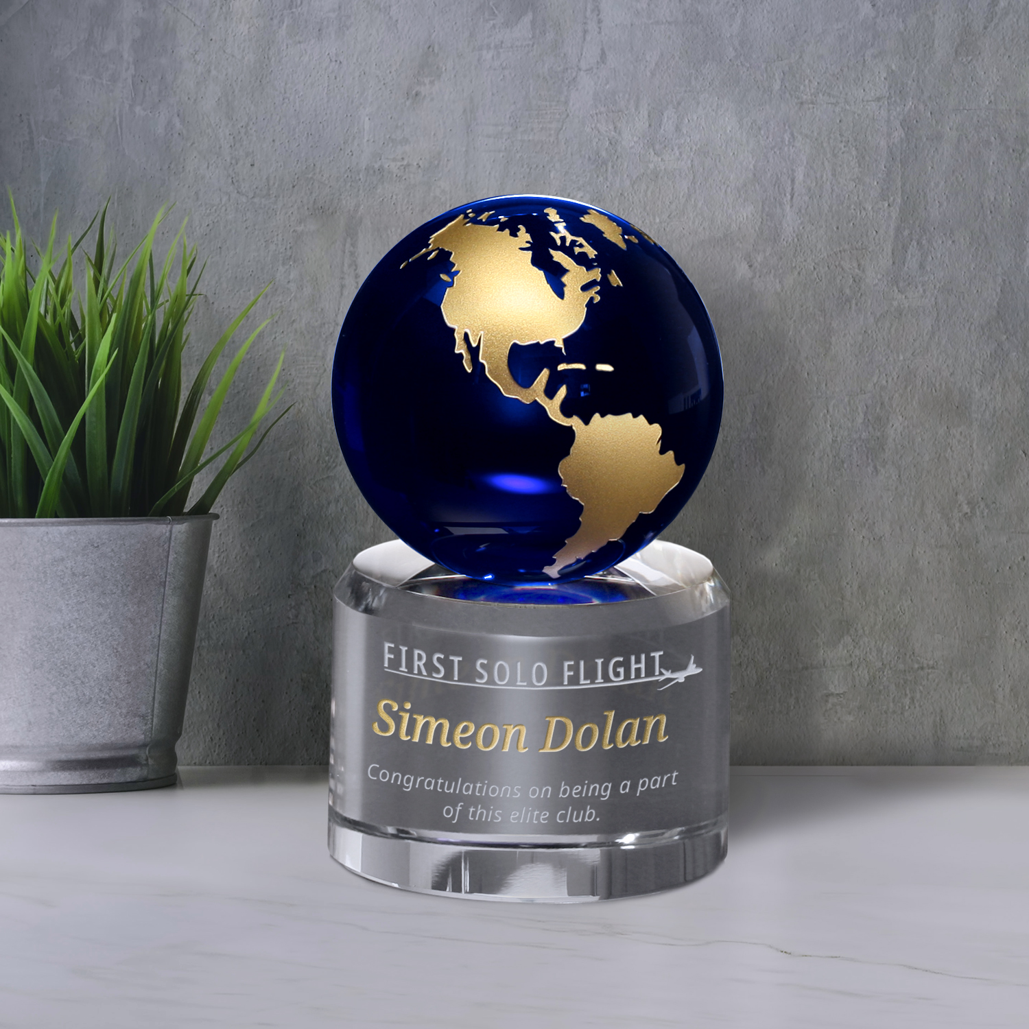 A deep blue globe with gold continents is perfect for worldwide excellence. The Navigator Globe will leave a lasting impression on your recipients.