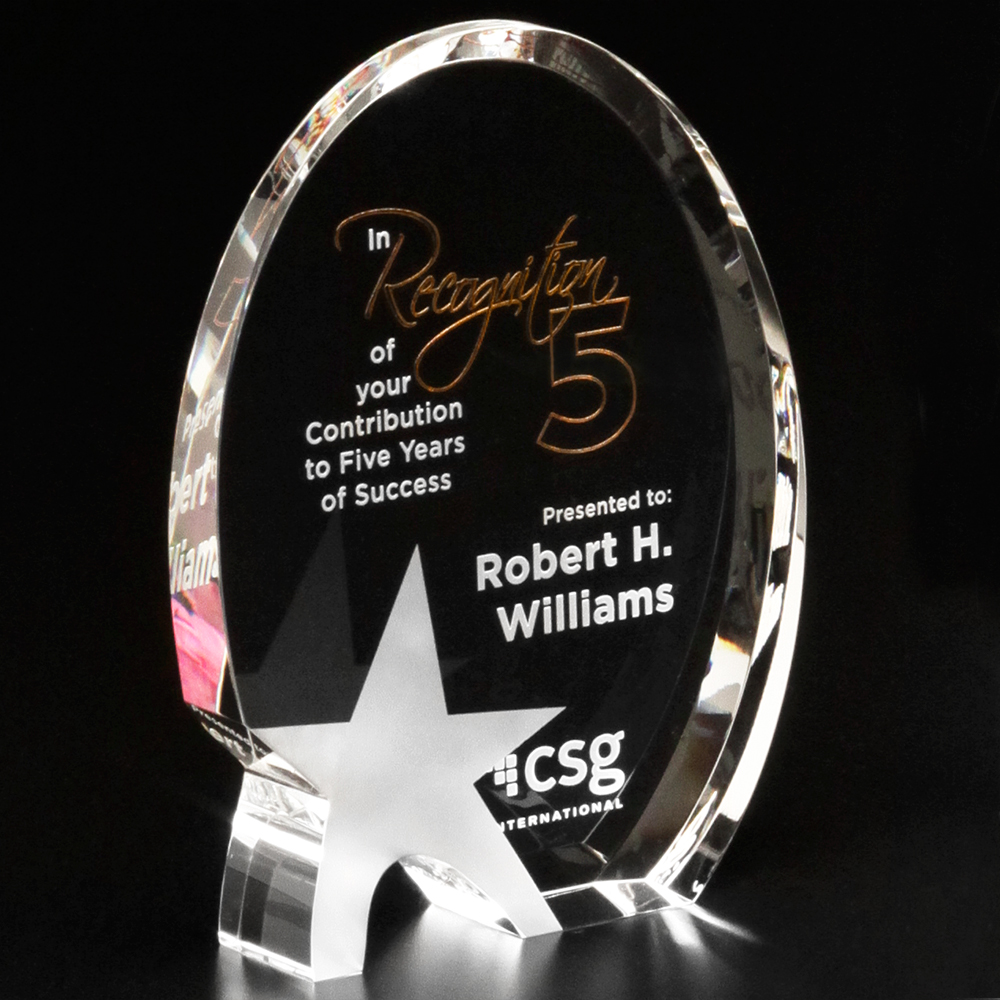 The Oval Star showcases its five points subtly. This lovely award is totally flawless and crystal clear; it can be customized with a special message or imprint to relate to any recognition occasion honoring a job well done.