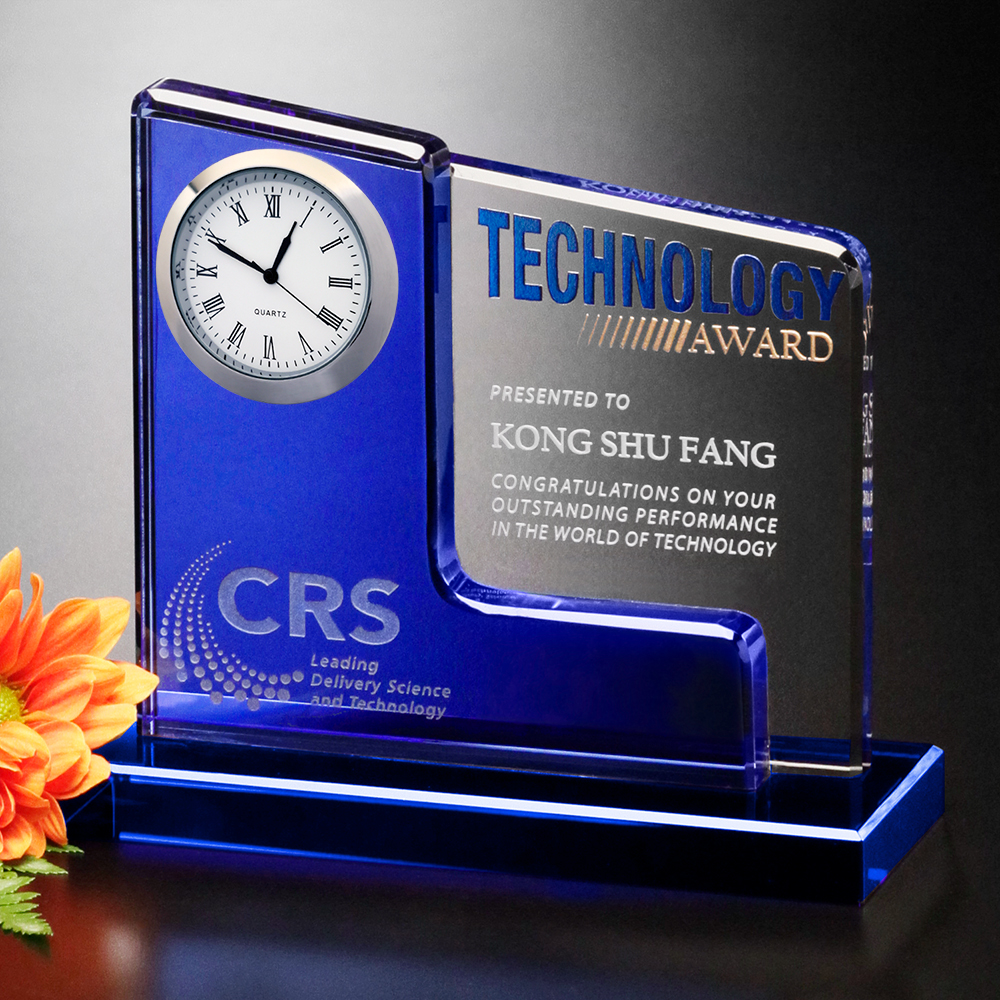 The balance of optical crystal and striking blue crystal create a dynamic design in the Oxford Clock. This award offers generous area of heartfelt sentiments of recognition and honor.