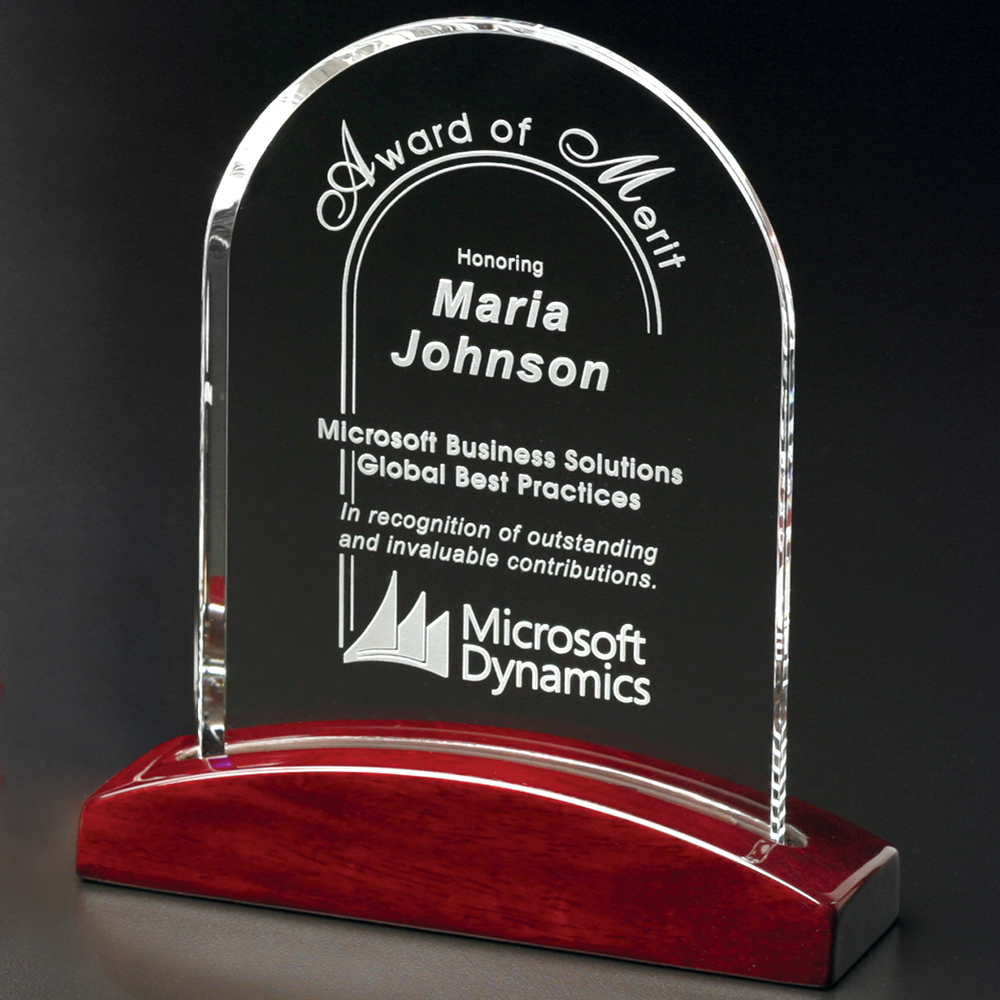 The Parkdale Gallery features optical crystal awards combined with a dramatic piano finish base. Choose from an arch, rectangle, triangle or square. The Parkdale Arch provides ample area for personalization and sentiments.
