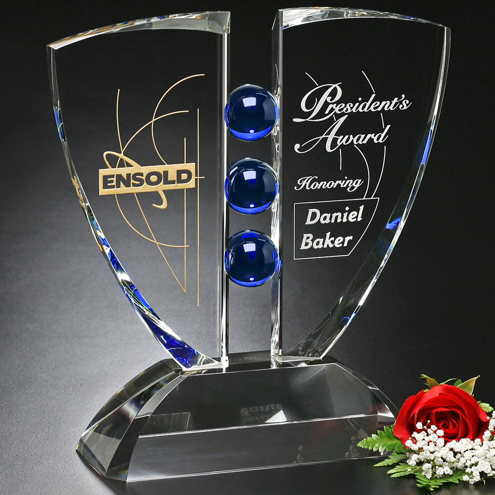 The Pinion Indigo Award is an elegant fan-shaped award, containing three floating blue crystal spheres between the two sides and a clear beveled optical crystal base. The award can be customized with your personal image or message. The Pinion Indigo Award is available in three sizes.