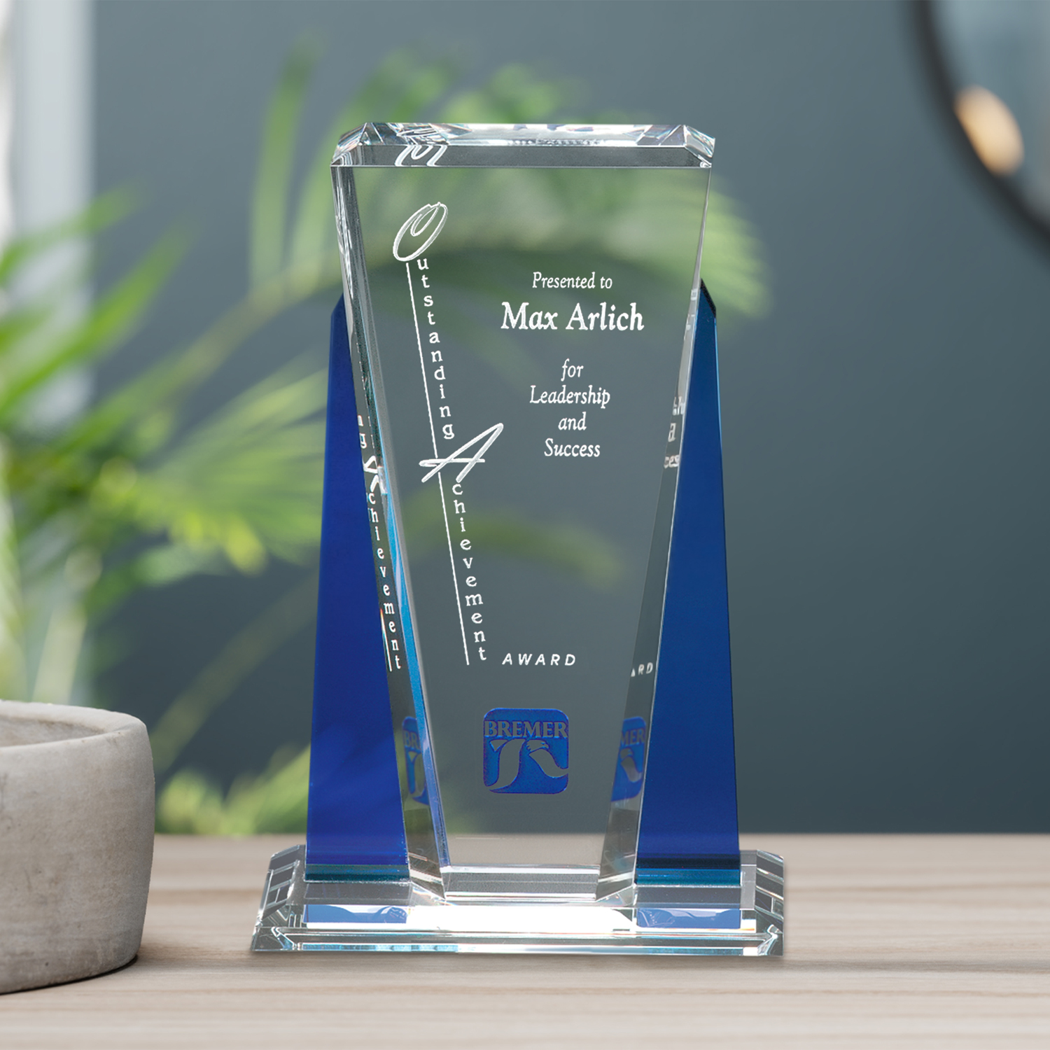 The intricate bevels in this optically clear inverted pyramid, precisely coupled with two blue optical crystal pyramids, give a diamondesque appearance to the Sentinel Award.