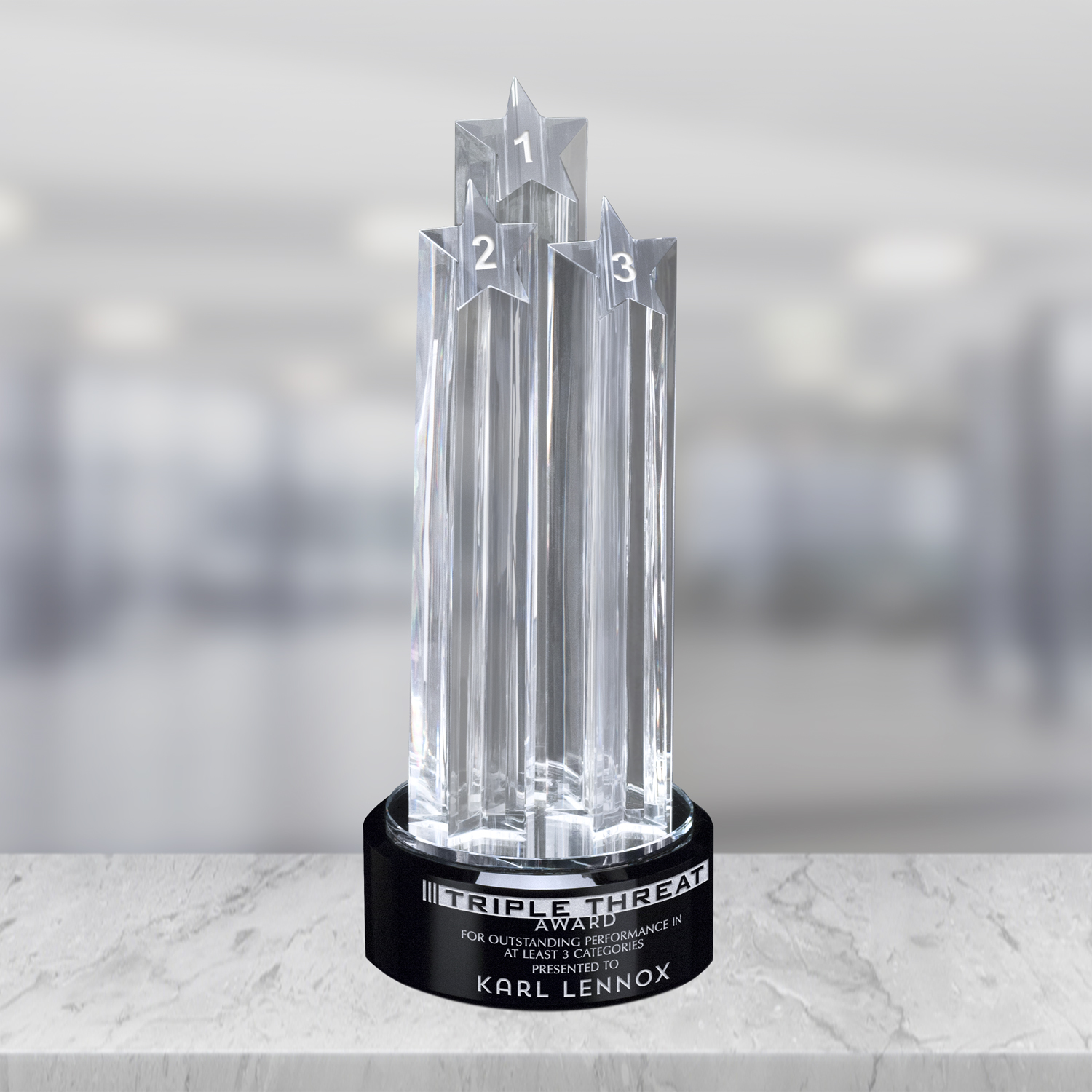 Use this award to honor three-fold achievement. Each star pillar can represent one of the three achievements, making it even more special to the recipient.