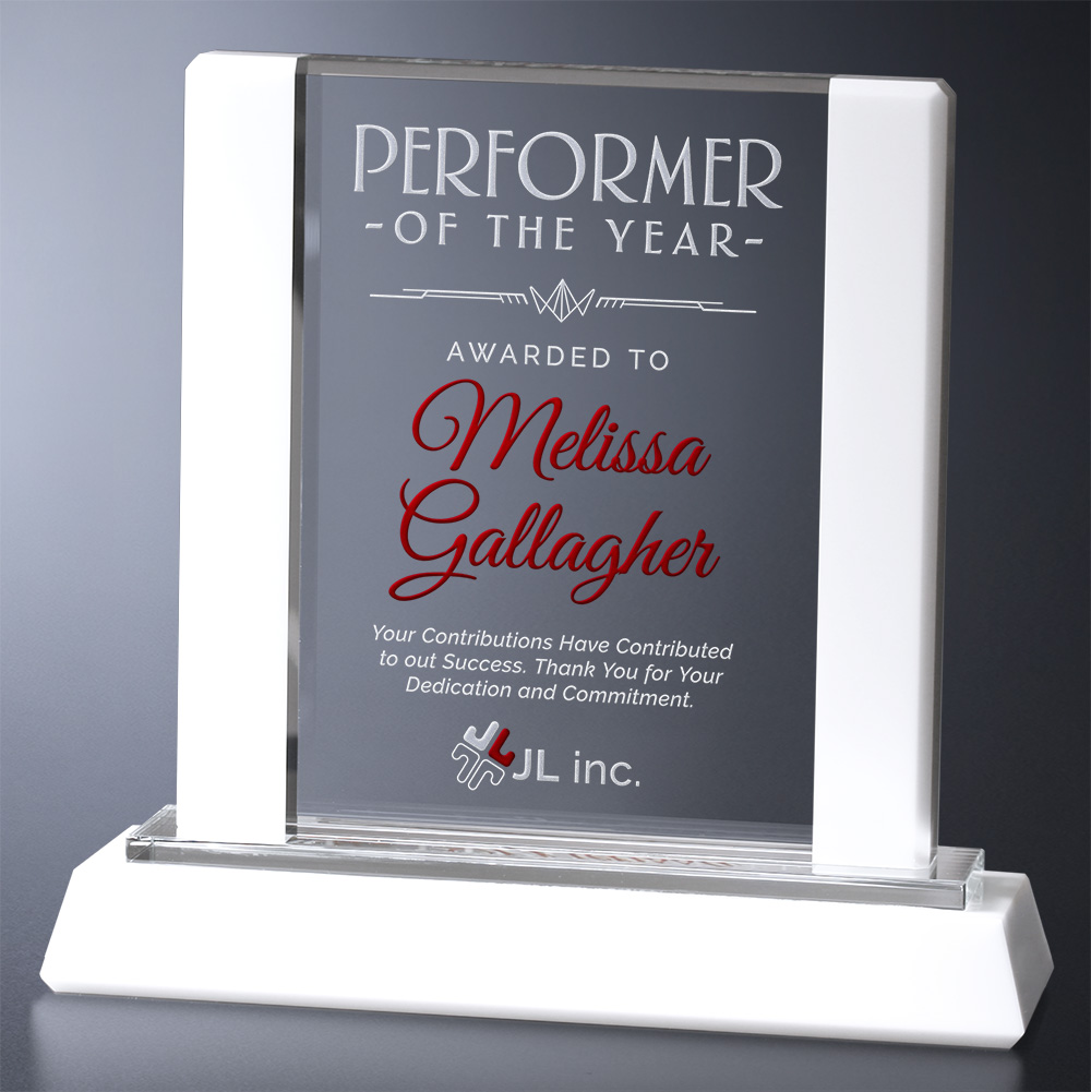 Bright white accents hug the sides of a clear square panel on the massive Verona Award. Reward the biggest achievements with this spectacular award.