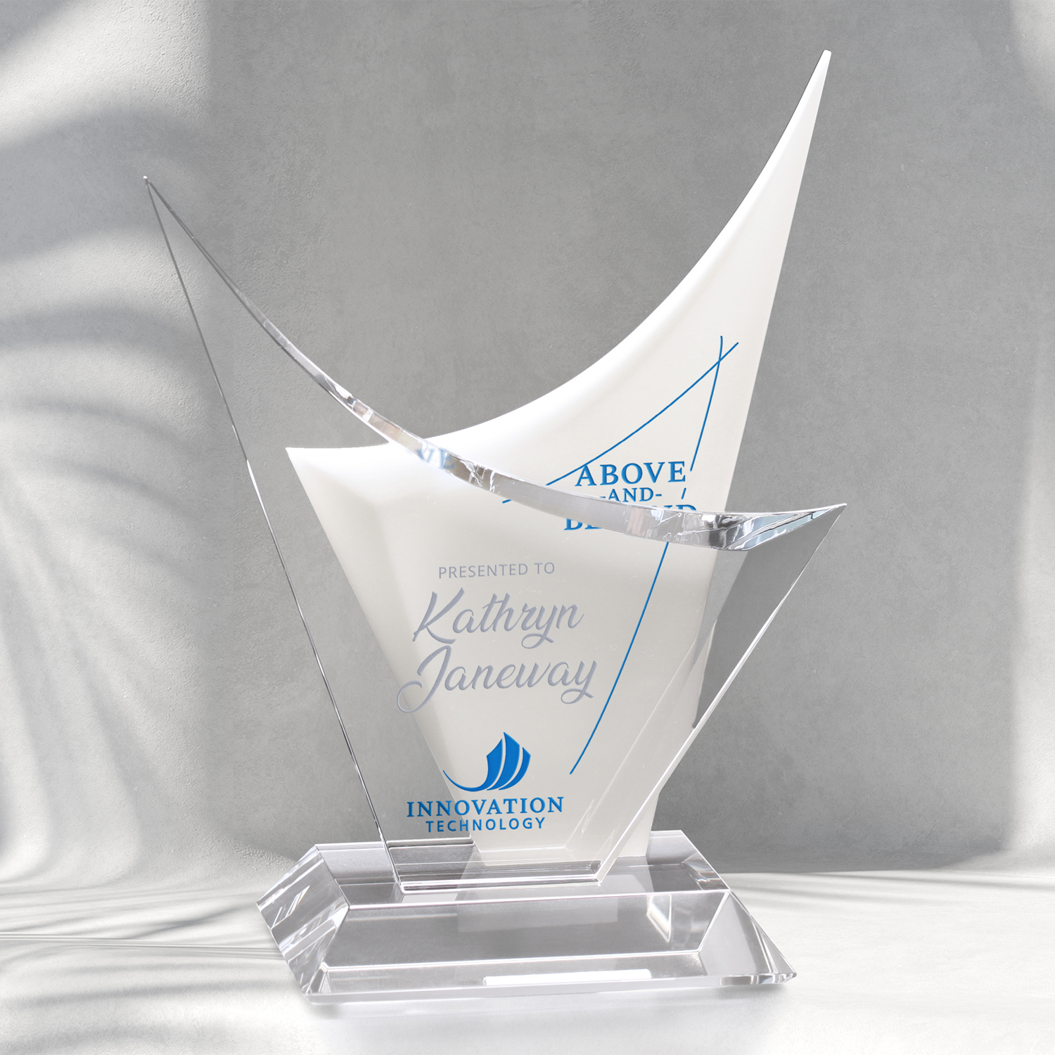 The Voyager Award features a stunning design that is sure to excite any recipient. An optical crystal swoosh opposing a smiliarly shaped white crystal swoosh creates a stunning award for any recognition occasion.