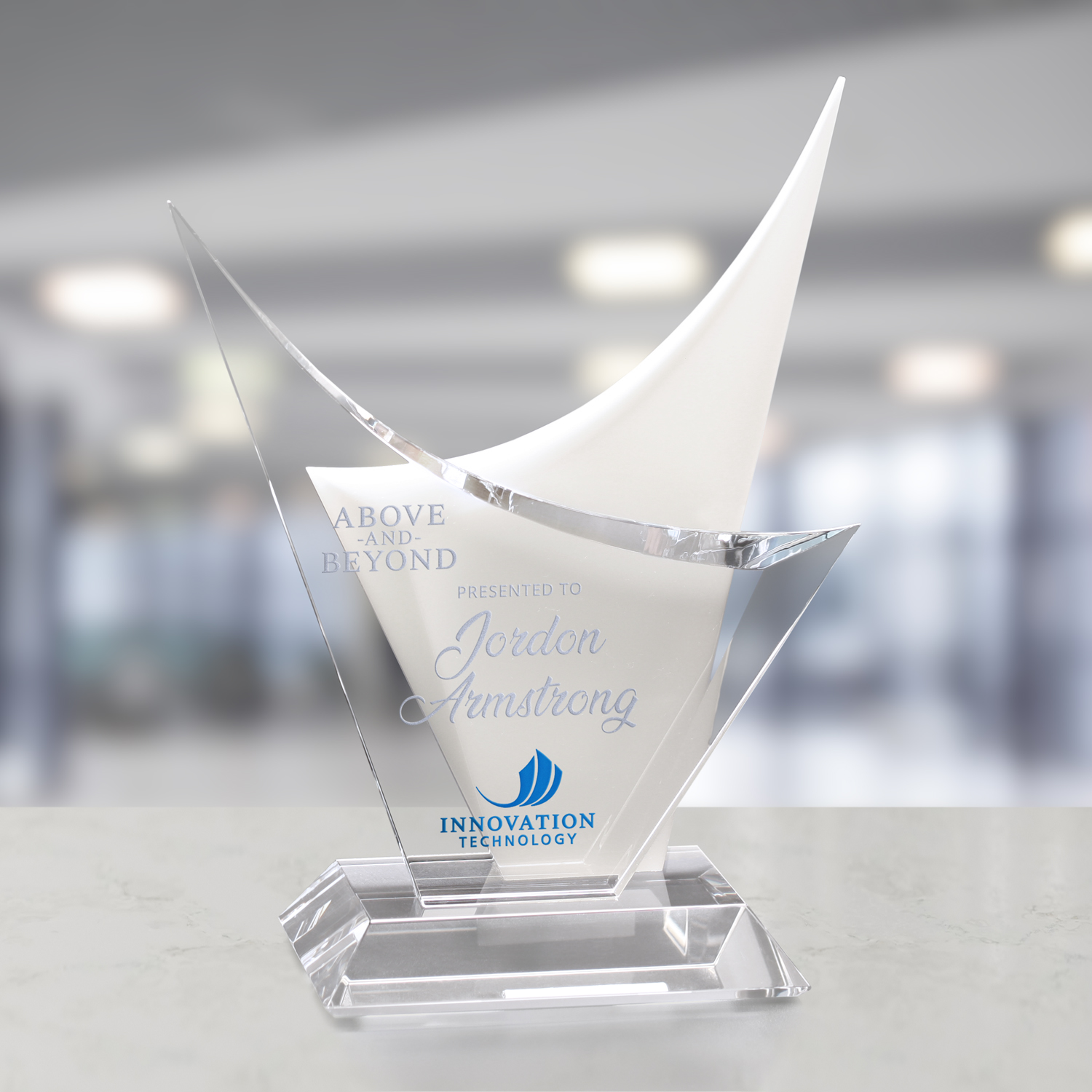 The Voyager Award features a stunning design that is sure to excite any recipient. An optical crystal swoosh opposing a smiliarly shaped white crystal swoosh creates a stunning award for any recognition occasion.