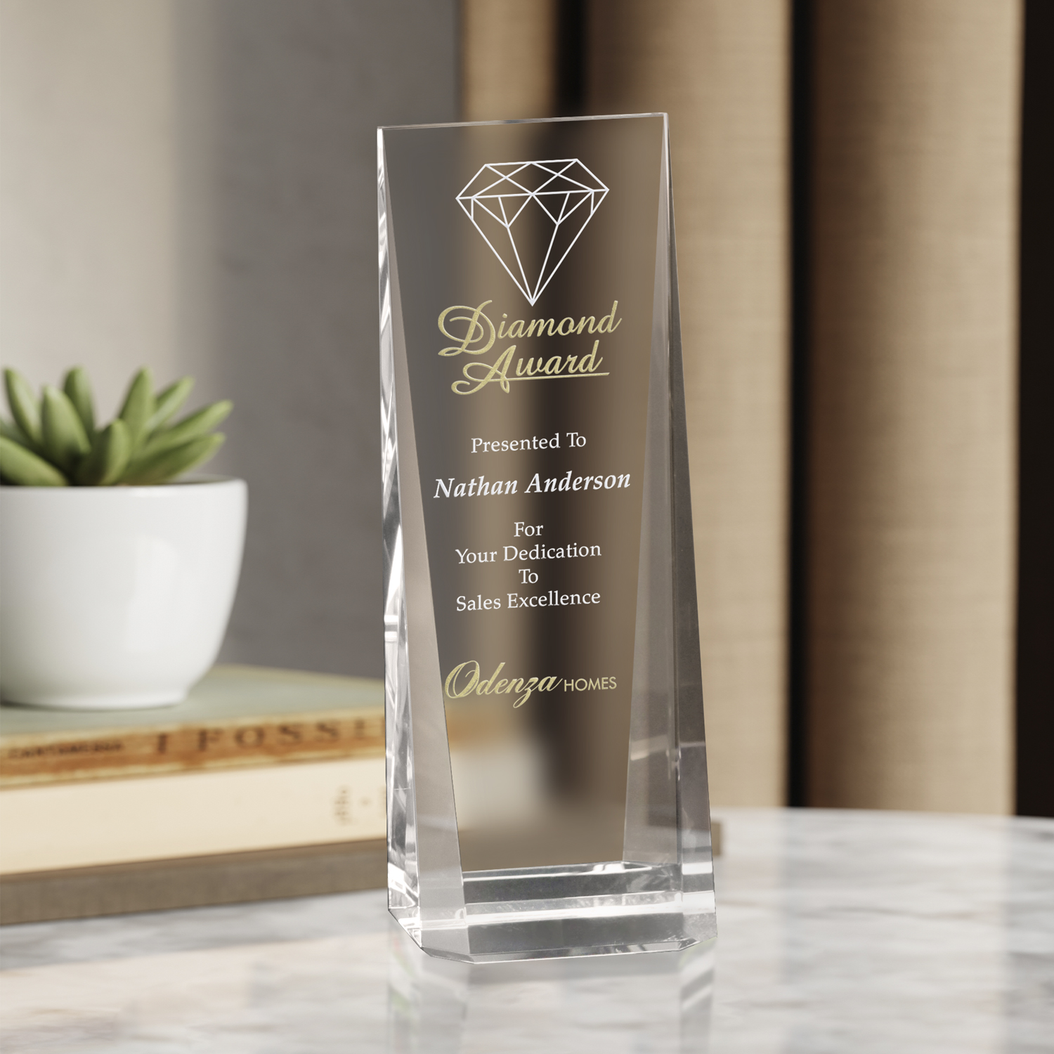 The Westby Wedge is an elegant wedge of optical crystal that you can customize with an image and personal message of your choice. This spectacular award is available in three sizes.