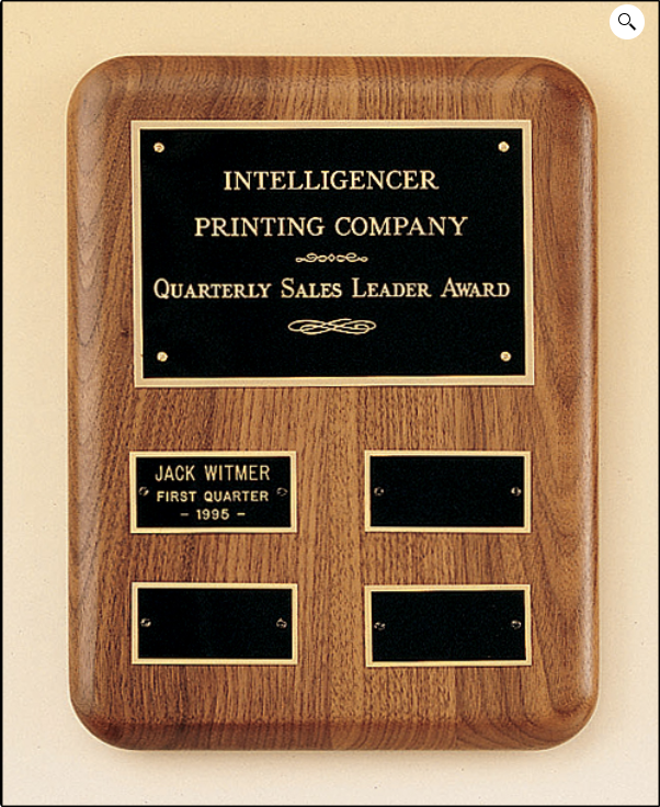 American walnut is the benchmark material for a quality recognition plaque. The grain and warmth of solid walnut backing communicates quality before anyone reads the engraving. Combined with a brass or black engraving plate, a walnut plaque fits naturally in office environments, school hallways, athletic facilities, and home offices. Viking Awards offers walnut plaques in multiple sizes with a variety of plate and border options  the American Walnut Plaque with Black Brass Plate is a clean, versatile option that works across contexts, while the American Walnut Plaque with Black Engraving Plate and Gold Border steps up the formality for executive-level or featured individual recognition.